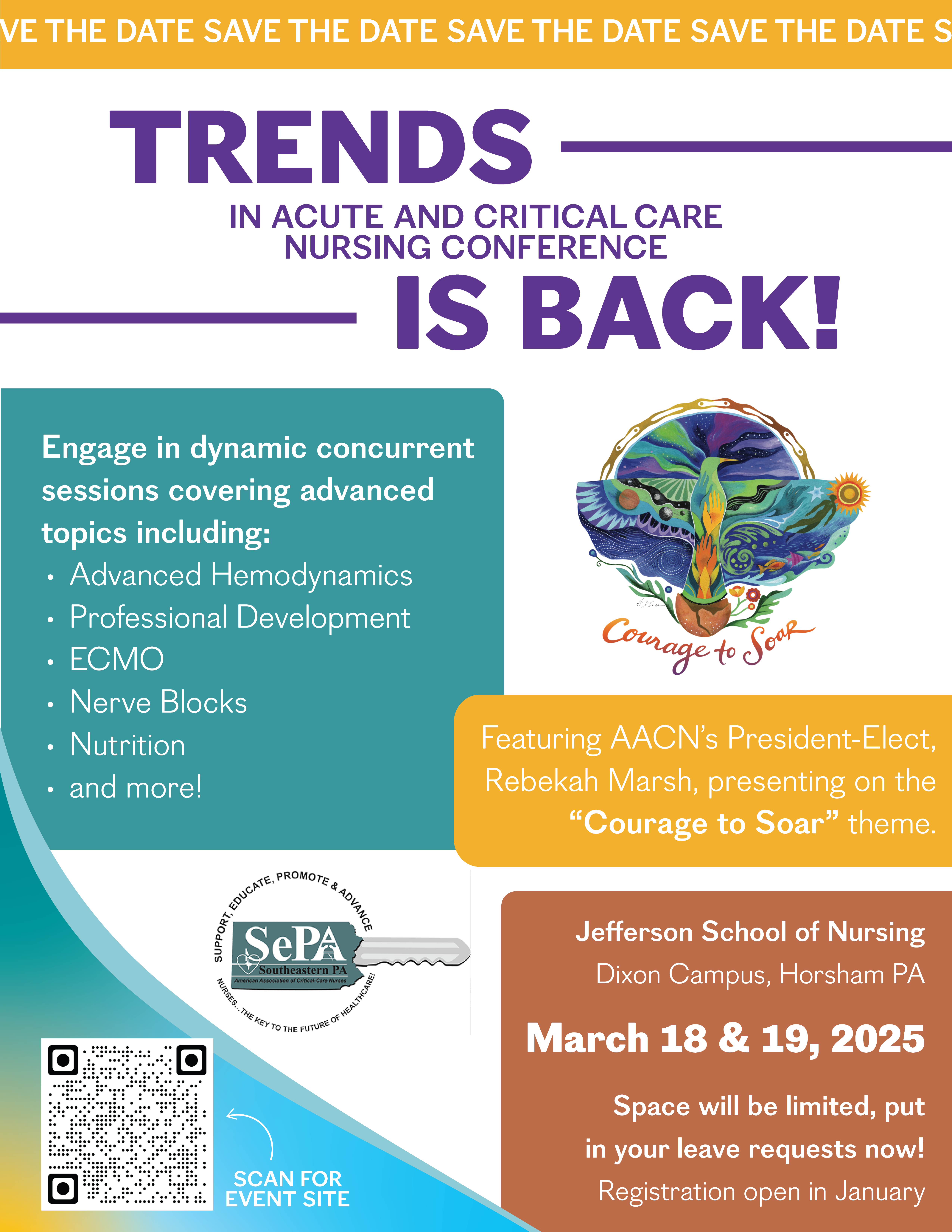 Please continue to save the date for our TRENDS in Critical Care and Acute Care Nursing on March 18 and 19, 2025. Our conference will be held at the Jefferson Dixon Nursing Campus in Horsham, Pennsylvania. Registration will open mid-January, 2025. Please see the attached flyer for more information, and feel free to print and post around your work environment for your colleagues to see! We hope to see you there!
